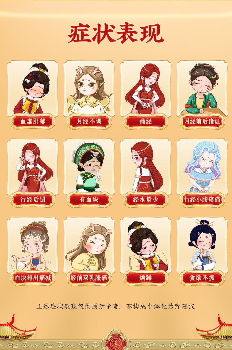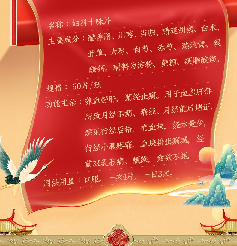 【成份】:香附(醋炙)、当归、熟地黄、川芎、延胡索(醋炙)、白术、赤芍、白芍、大枣、甘草、碳酸钙。