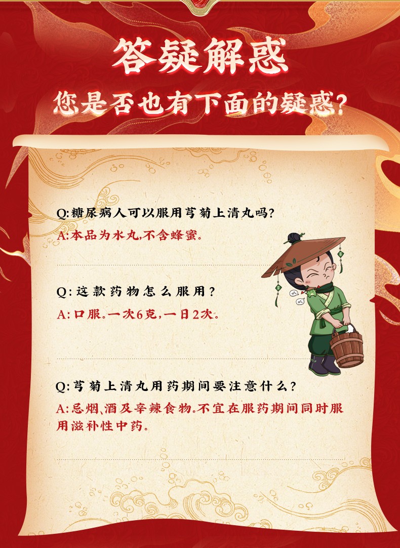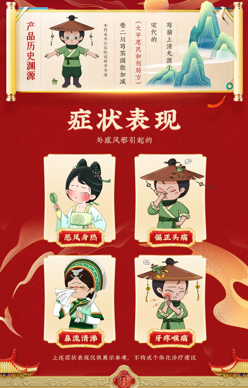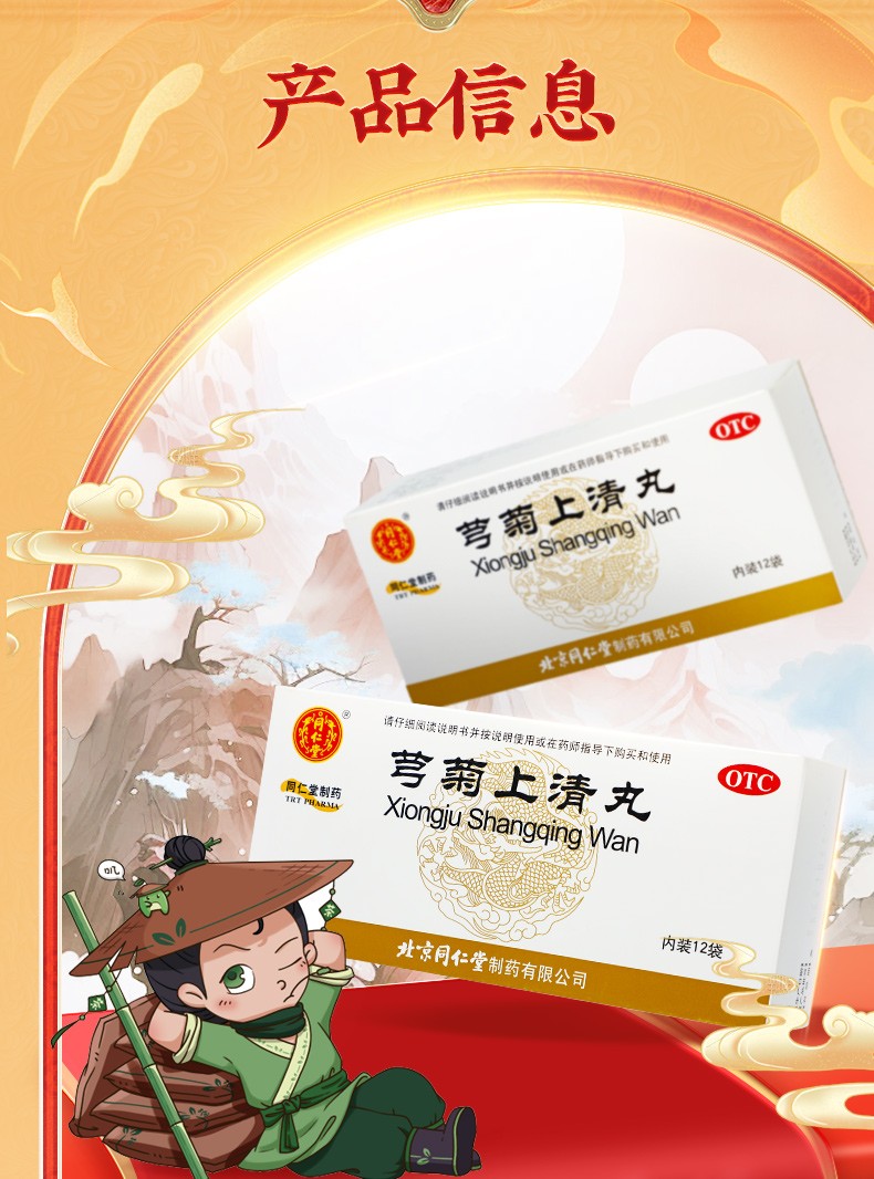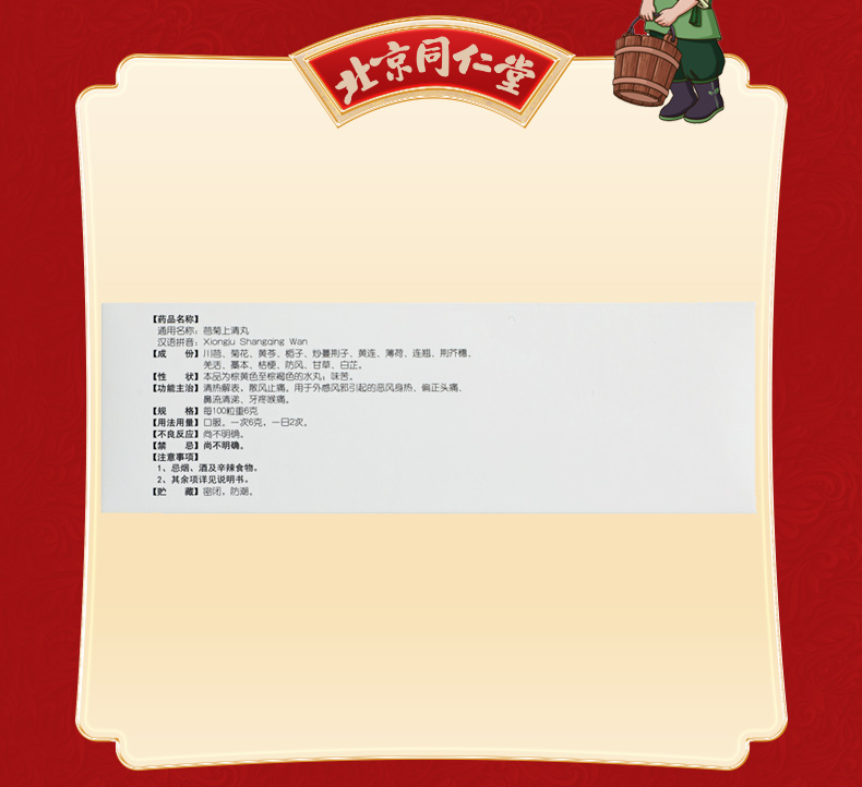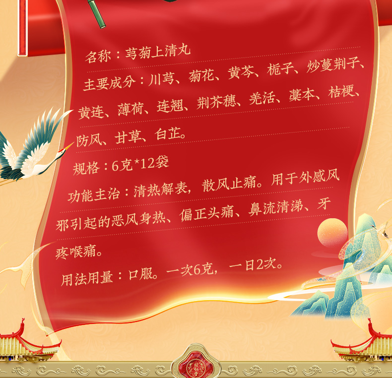 【成份】:川芎、菊花、黄芩、栀子、炒蔓荆子、黄连、薄荷、连翘、荆芥穗、羌活、藁本、桔梗、防风、甘草、白芷。
